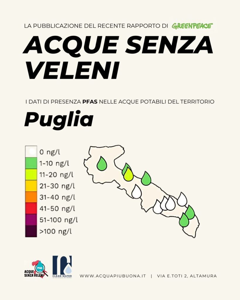 Il rapporto “Acque senza veleni” di Greenpeace Italia ha acceso i riflettori sulla contaminazione da PFAS nelle acque potabili di diverse regioni italiane, evidenziando criticità anche in Puglia. L’analisi condotta tra settembre e ottobre 2024 ha rilevato la presenza di PFAS in diverse aree, con particolare attenzione al comune di Andria, dove è stata riscontrata una concentrazione di 17,4 ng/l di PFAS totali e 3,0 ng/l di PFOA. Sebbene questi valori rientrino nei limiti di legge attuali, destano preoccupazione per la loro persistenza nell’ambiente e i possibili effetti sulla salute pubblica. La situazione in Puglia evidenzia la necessità di un monitoraggio continuo e di strategie efficaci per la riduzione della contaminazione, attraverso l’adozione di sistemi di filtrazione avanzati e politiche di tutela delle risorse idriche.