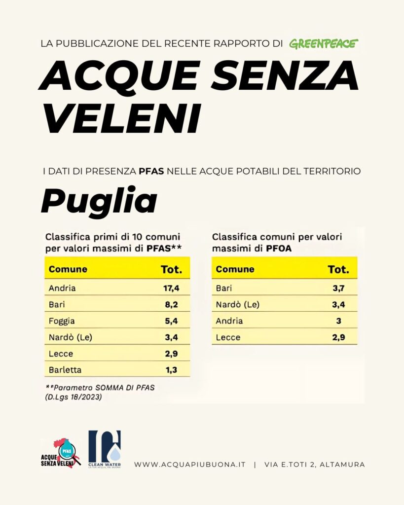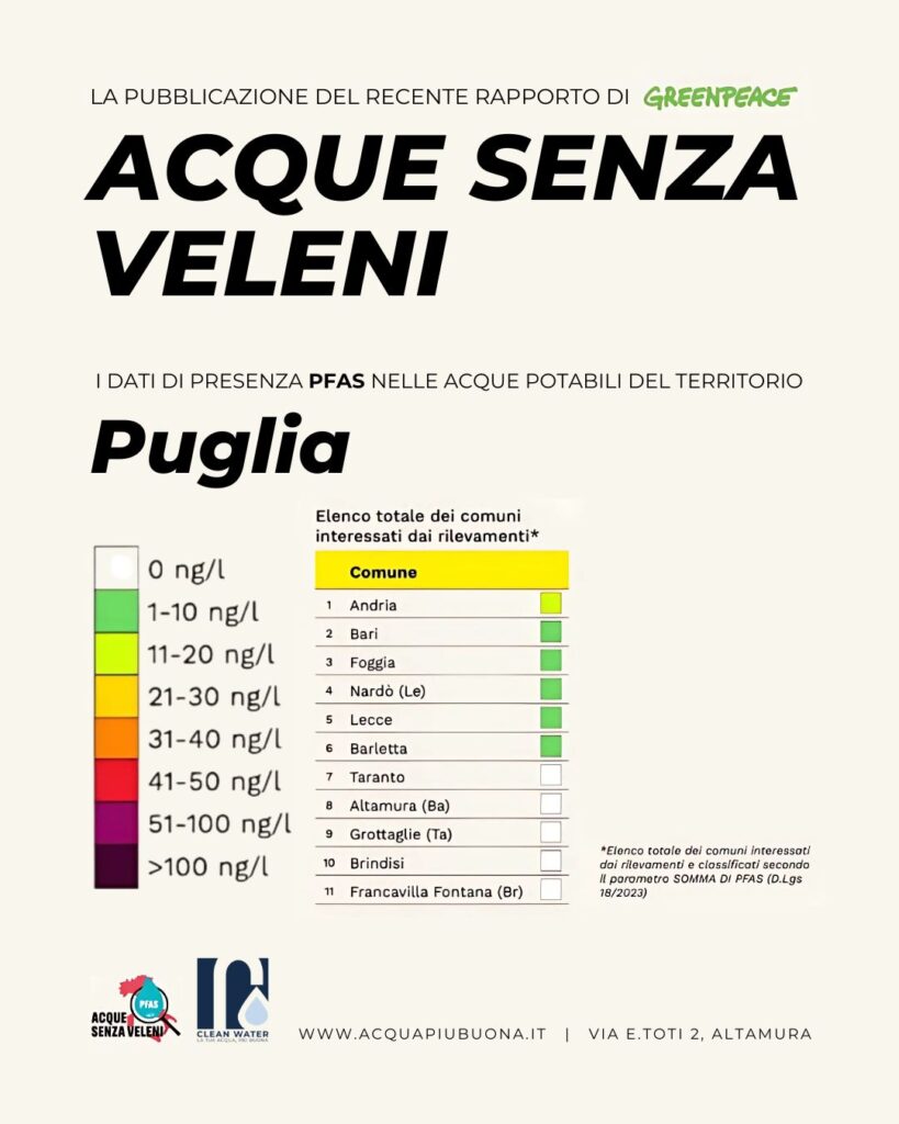 Negli ultimi anni, la qualità dell’acqua potabile è diventata un tema sempre più rilevante per cittadini e istituzioni. Il recente rapporto di Greenpeace Italia, intitolato “Acque senza veleni” (Greenpeace), ha evidenziato la presenza di PFAS nelle acque potabili di diverse regioni italiane, con particolare preoccupazione per il comune di Andria, in Puglia.